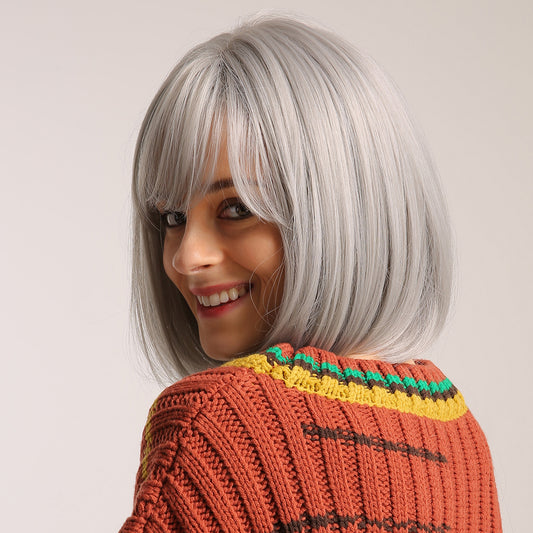 COCO【WA-SS180-2】12inches Short Straight Bob Wigs for Women Synthetic Wig Silver with Bangs for Cosplay Daily Party