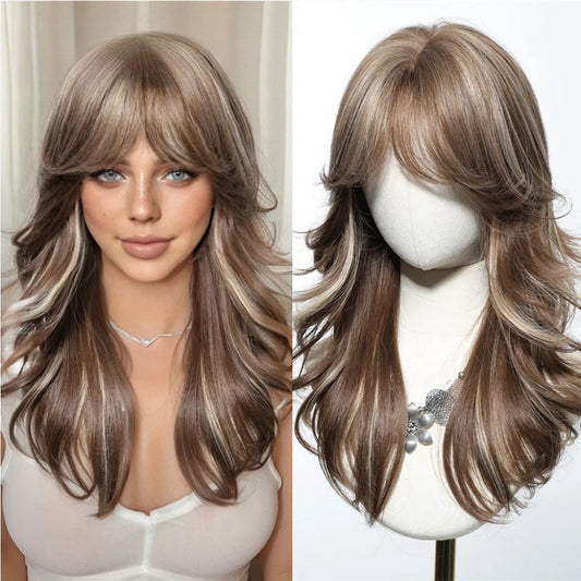 Berlinda【WA-LC3076-1BR20】 Brown Blonde Highlight Wig with Bangs 20 inch Butterfly Cut Synthetic Trending for Women Daily or Party