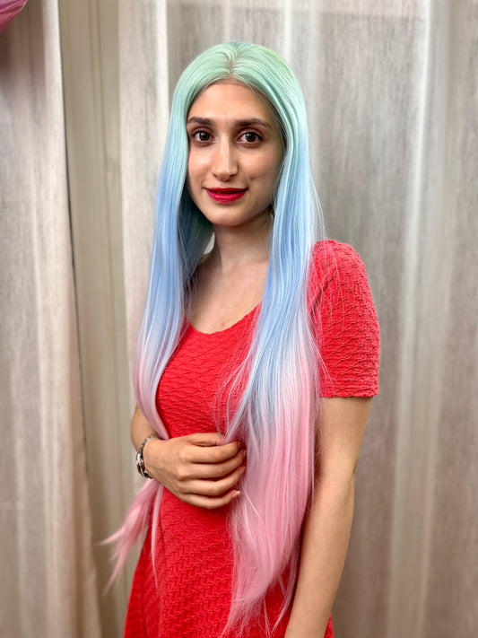 JADE【WA-YHCXZYM7-1001】30inches Frontal Lace Ombre Green Blue Pink Highlight Wig Straight Synthetic Heat-resistance Daily or Party
