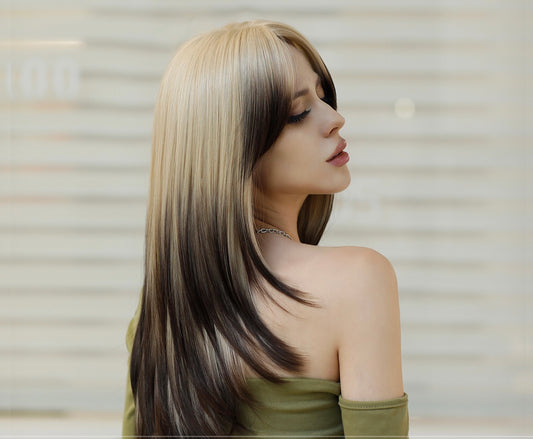 PORTIA【WA-XY9039】25inches Ombre Blonde Brown Wigs Synthetic High Temperature Resistant Straight with bangs Wig Daily or Party