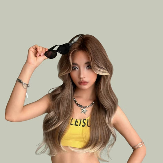 BELLA【V-002-A09】 Cool Brown Long Curly Hair Convertible Bangs 65CM High-temperature Fiber Sweet Cute Wig for Women Daily & Party