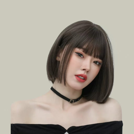 AMARA 【V-001-D-171】Brown Short Hair with Turned-Out Ends Convertible Bangs 35CM High-Temperature Matte Fiber Fashion Wig for Women Daily & Casual