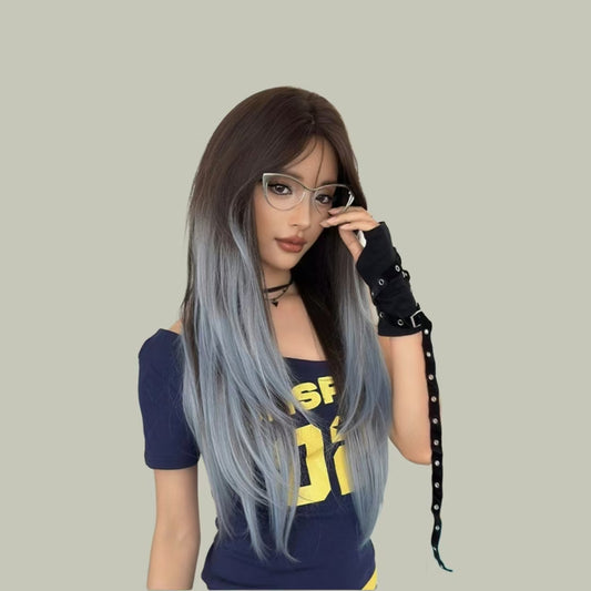 IVY【V-008-C-0493】Gradient Denim Blue Center-Parted Long Straight Hair 75CM High-temperature Fiber Celebrity Fashion Wig for Women Daily & Stylish